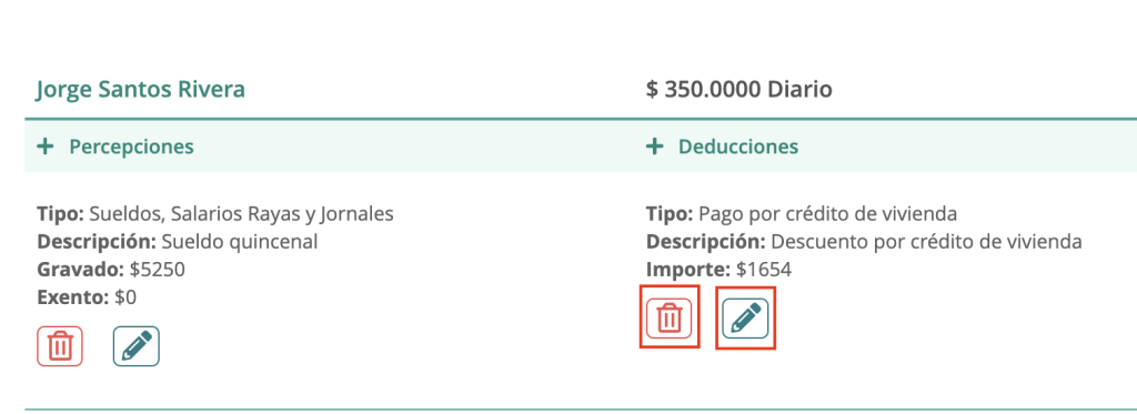 - Importe: Se debe registrar el importe de un concepto de deducción (descuento) y debe ser mayor que cero.