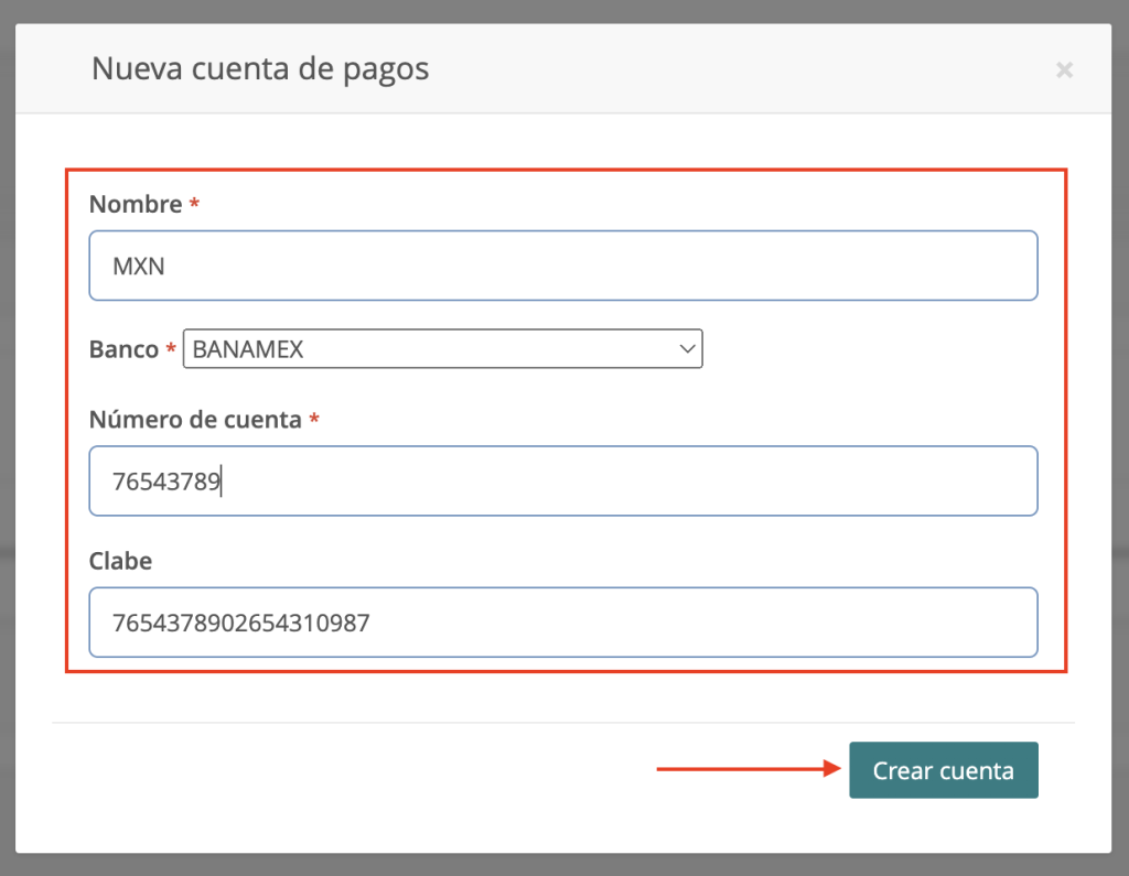 Define el nombre de tu cuenta bancaria, el banco a la que pertenece, tu número de cuenta y de manera opcional, la cuenta clabe de la misma, al terminar presiona en “Crear cuenta“: