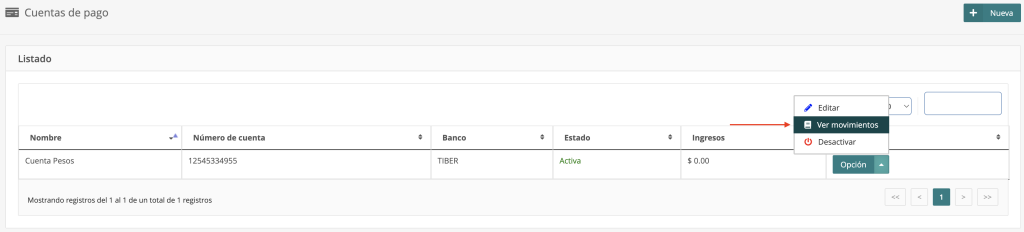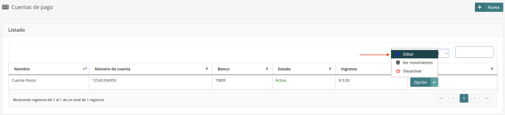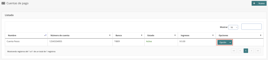 Una vez creada, está el botón “Opción” donde podrás editar la cuenta, ver los movimientos ó desactivarla.