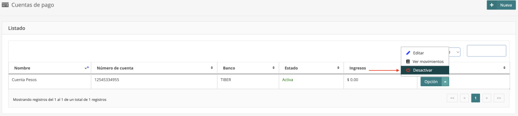 También se tiene la opción “Desactivar“, esta opción desactiva la cuenta y ya no aparecerá para que puedas seleccionarla al pagar una factura.