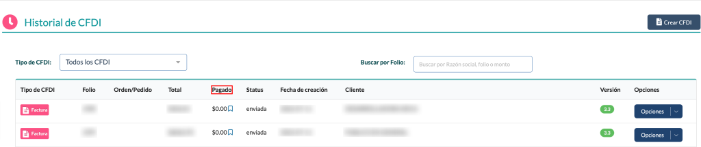 Al revisar en el Historial en la columna Pagado aparecerá una paloma indicando que esa factura ya está abonada a una de las cuentas agredas.