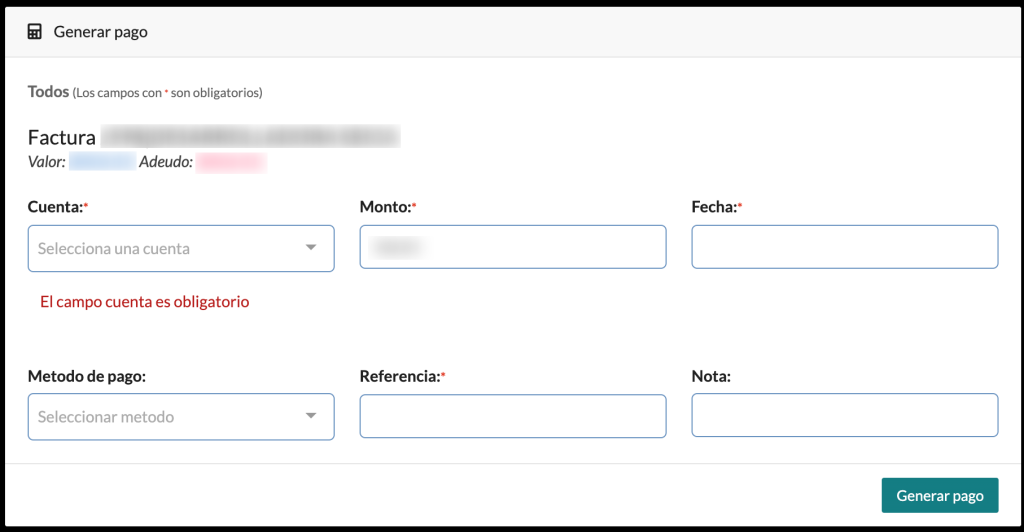 - Método de pago: selecciona, de una lista desplegable, el método de pago para esta factura.